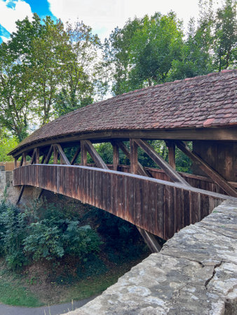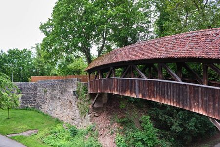 Medieval covered wooden bridge over the city moat in Rothenburg.