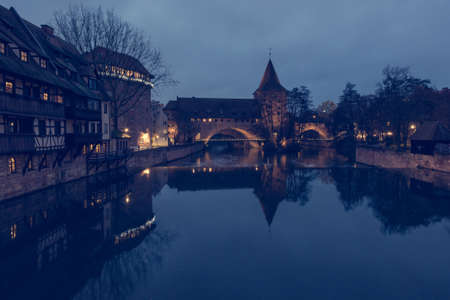 Nuremberg, Germany, beautiful old bridge with medieval tower along the river with reflections
