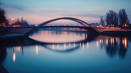 An elegant, modern bridge arching over a calm river, illuminated by soft lighting in the evening