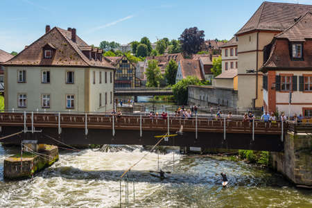 Bamberg, Germany - May 22, 2016: Tourists on a bridge and canoe slalom on the River Regnitz, Bamberg, Bavaria, Germany, Europe.