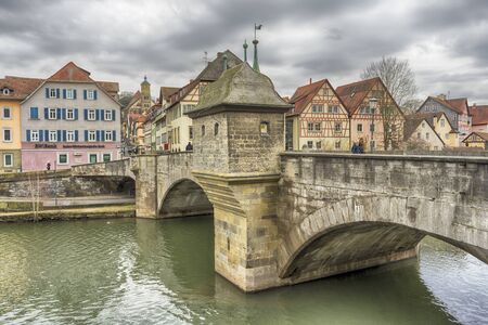 Bamberg, Germany - June 15, 2019: bridge over the river Regnitz in the old town of Bamberg, Bavaria, with unidentified people. Bamberg is a city in Bavaria and well known for its medieval old town