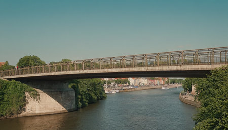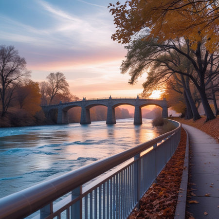 Iconic Grey Concrete Bridge Captures the Serene Beauty of River --ar 3:2