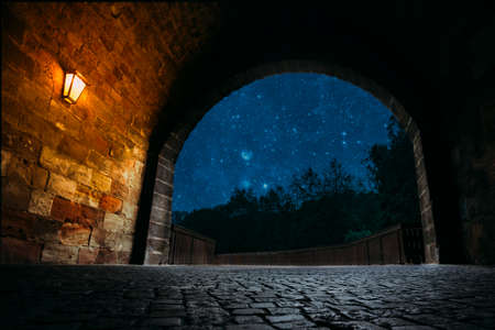 Night view of medieval bridge crossing a river.