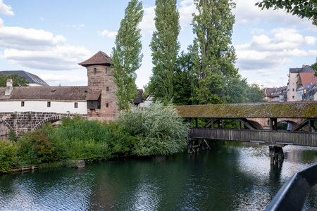 Scenic view of Henkerhaus Museum, Wasserturm, and both medieval bridges Henkersteg and the second wooden bridge in Nuremberg, Bavaria, overlooking the Pegnitz River.
