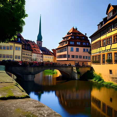 Traditional Bavarian buildings along the Pegnitz River in Nuremberg, Germany, reflecting on calm waters and showcasing classic architecture in a charming historic setting.