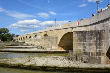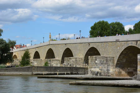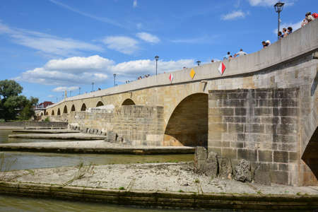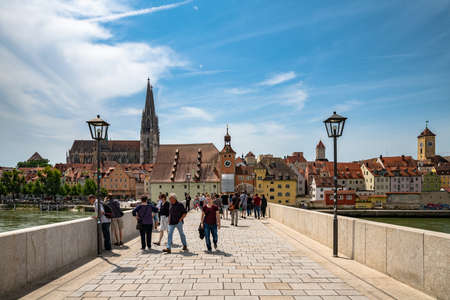 Regensburg, Germany - June 10, 2019 - Tourists walking on the tone bridge towards the historical old town with the St. peter cathedral of Regensburg or Ratisbon on the river side of Danube, Bavaria, Germany