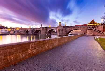 Old medieval stone bridge with sculptures in the night illumination. Germany. Wurzburg Bavaria