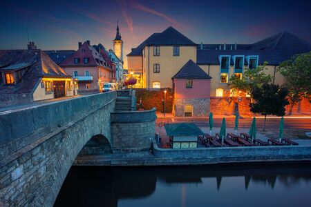 Old town hall or Altes Rathaus with two bridges over the Regnitz river at night in Bamberg, Bavaria, Franconia, Germany