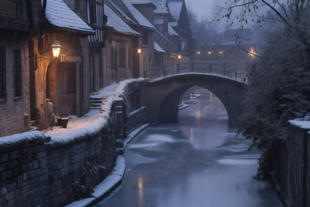 Snow covered bridge arching over a partially frozen canal at dusk, with illuminated half timbered houses lining the waterway in winter in France