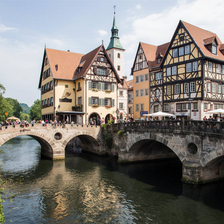 Scenic view of Nuremberg's Henkersteg Bridge with Henkerhaus Museum and Wasserturm in Bavaria, Germany, capturing historic timber architecture reflected over the Pegnitz River.