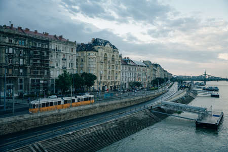 yellow tram in budapest city, hulgary - nov, 2021. High quality photo