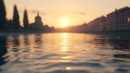 A tranquil river reflecting a beautiful sunset, surrounded by historic buildings and trees faintly visible. The atmosphere conveys peace and nostalgia, inviting contemplation.