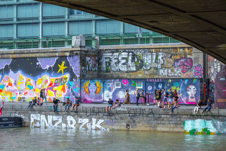VIENNA, AUSTRIA - MAY 25: Many people are relaxing with alcohol drinks on a day off in a beautiful summer weather on the banks of the Danube Canal(Donaukanal) in Vienna, Austria, on May 25, 2019.