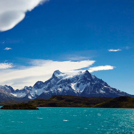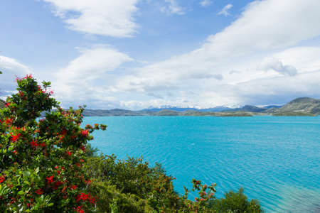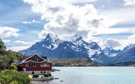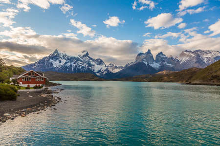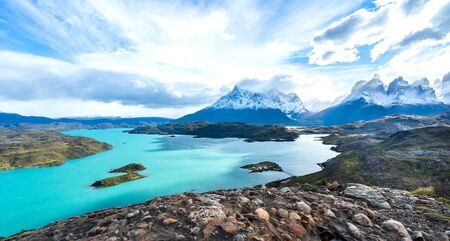 Travel to Chile. Picturesque lake Pehoe in the Patagonian Andes. The famous snow-capped cliffs of Los Cuernos by the lake. The lake with bright azure water from melting glaciers.