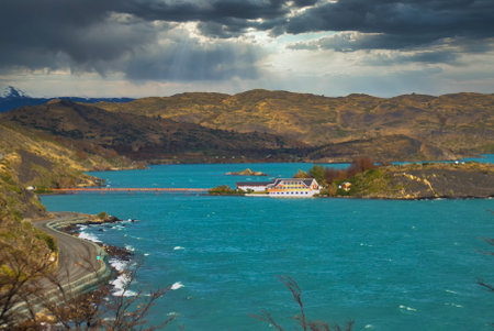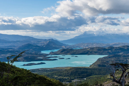 Landscape with lake Lago del Pehoe in the Torres del Paine national park, Patagonia, Chile.