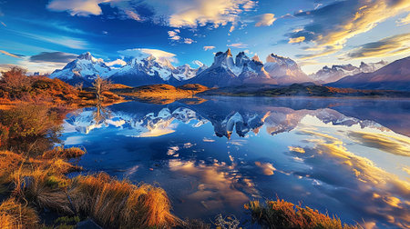 a wide angle view of lake pehoe and the paine massif from a lookout on a autumn sunrise at torres del paine national park in patagonia, chile