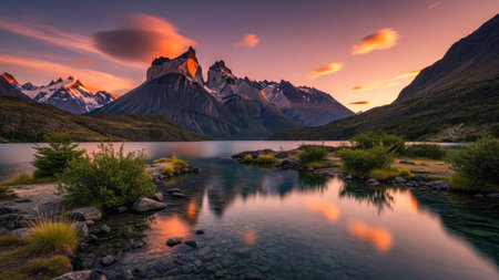 Mountains reflected in a lake at sunset, Torres del Paine National Park, Chile