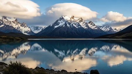 Patagonia landscape with lake and mountains reflected in water, Argentina