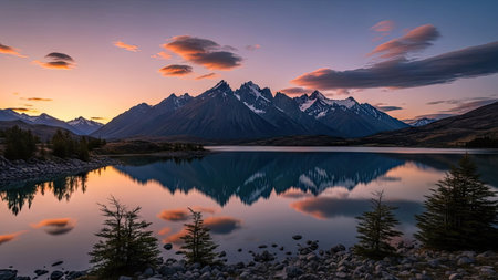 Natural landscape of New Zealand alpine lake and mountain range at sunset
