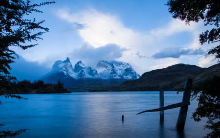 View of Paine Horns mountains in Torres Del Paine, over the lake during the evening with light reflections.