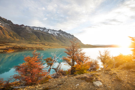 View of Torres Mountains in the Torres del Peine National Park during sunrise. Autumn in Patagonia, the Chilean side