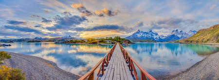 Scenic panorama picture of Lake Pehoe with view along a jetty