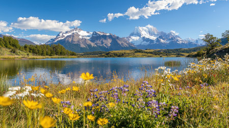 Vibrant wildflowers bloom in the foreground while a serene lake reflects majestic mountains under a clear blue sky in Patagonia on a sunny day.