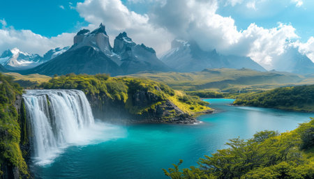 Patagonia landscape with snow-capped mountains and turquoise water