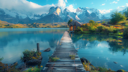 A picturesque natural scene featuring a wooden pier, a tranquil lake, and imposing mountains, with a small rustic cabin nestled amongst greenery.