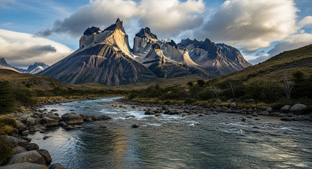 The Torres del Paine National Park view. Torres del Paine is a national park encompassing mountains, glaciers, lakes, and rivers in southern Patagonia, Chile.