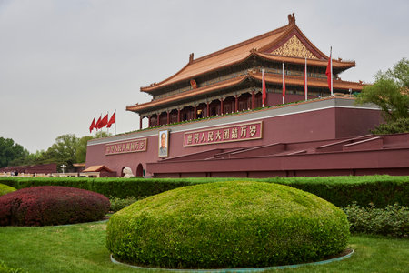 Beijing, China - April 27, 2010: Monumentl red-orange building and tall wall with photo of Mao is main entrance to Forbidden city. LBlue sky and people and cars in front. Broad black street surface.