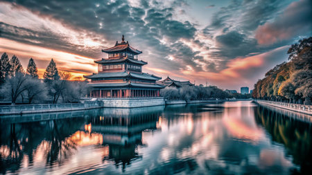 The vibrant hues of autumn paint the landscape surrounding the Forbidden City in Beijing. Early morning mist envelops the serene water, enhancing the peaceful atmosphere.