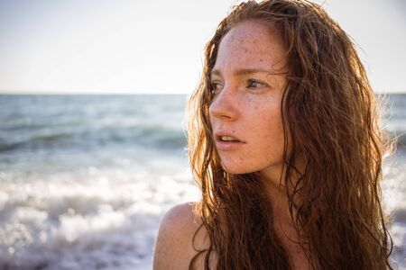 Young woman on a background of the sky. Hair blows in the wind. Red-haired girl on the coast. Joyful girl.