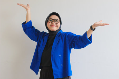 Beautiful young Asian Muslim woman in glasses, hijab and wearing blue blazer smiling confident and happy with both hands pointing up isolated on white background, advertising concept