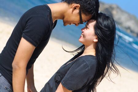 sweet and romantic lifestyle portrait of young Asian Korean couple in love enjoying holiday on beautiful beach walking together by the sea playful and carefree in happy relationship concept