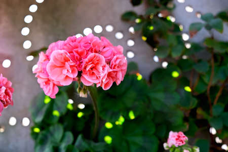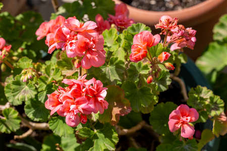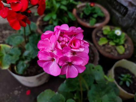 Potted pink Pelargonium flowers (Pelargonium hortorum) in the garden.