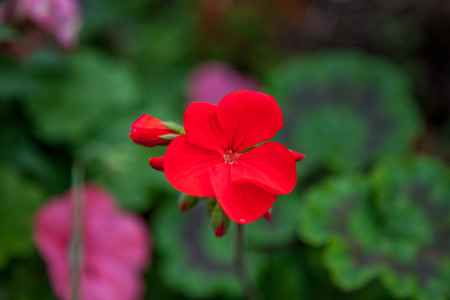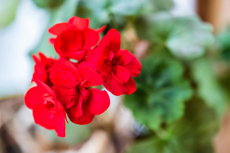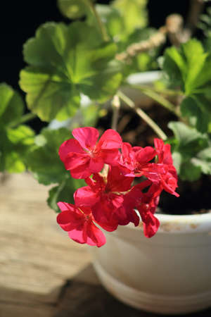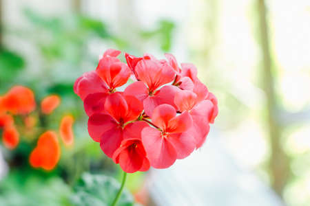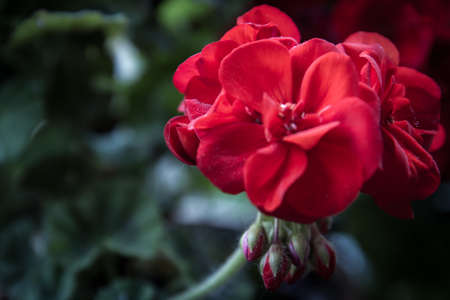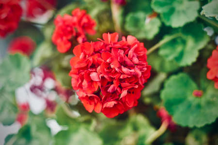 Beautiful red geranium flowers in blooming. Red flowers in close up