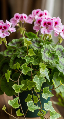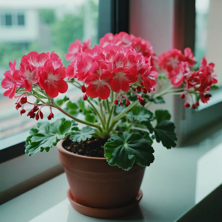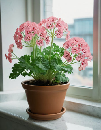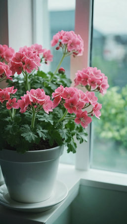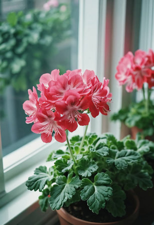 Vibrant pink geraniums blossom gracefully, soaking in the warm sunlight streaming through the window, adding life to a charming indoor garden setting.