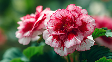 Striking Red and White Geranium Blossoms in Natural Light Garden Setting