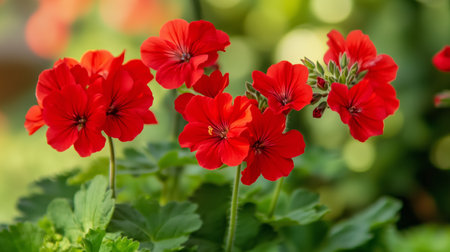 Vibrant red geranium flowers blooming in a sunny garden during late spring with lush green foliage surrounding them