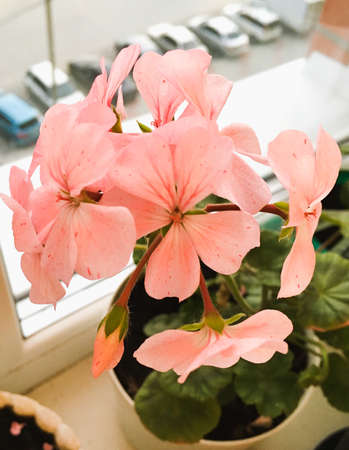 peach geranium, pink geranium indoor flower on the window and sunny glare