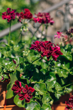 Beautiful dark red flowers of Crane's bill (Pelargonium)on a summer street. Selective focus.