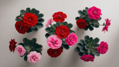 AI Generated. Vibrant Red and Pink Geraniums - Overhead View of Blooming Flowers