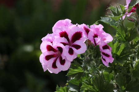 Terry pink pelargonium against green foliage and defocused background. Bokeh effect. Close-up side view. Place for an inscription.