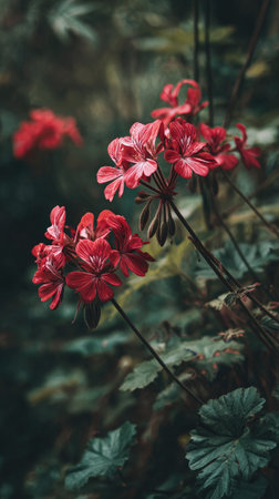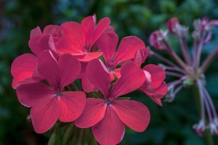 Flowers of red geranium against blurred dark . Can be used as a wallpaper or postcard.