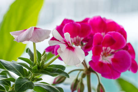 Blooming geranium on the windowsill. Close up of the blooming pink flower of geranium. flowers in pots. Beautiful little geranium pelargonium flower. The concept of comfort and home gardening.