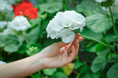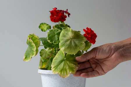Woman hand holding yellow leaf of blooming geranium damaged because of hotness and drought