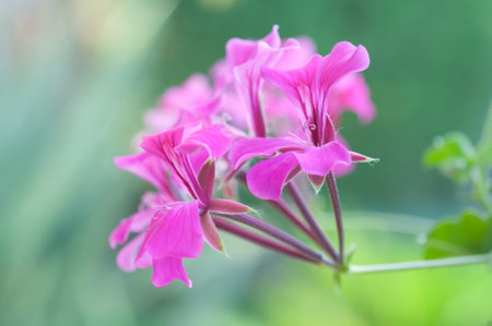 Closeup of beautiful blossom pink geranium in morning sunlight. Shallow depth of field.