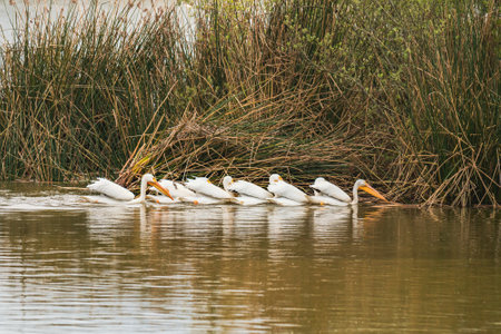 Pod of six White Pelicans swimming straight ahead side of estuary water working together to capture food to eat.