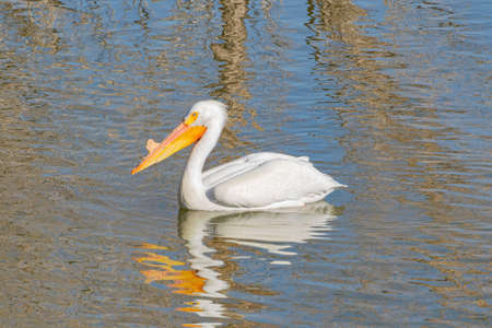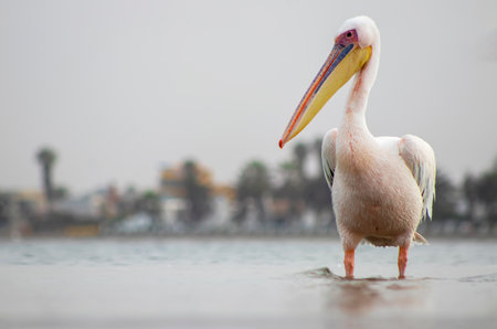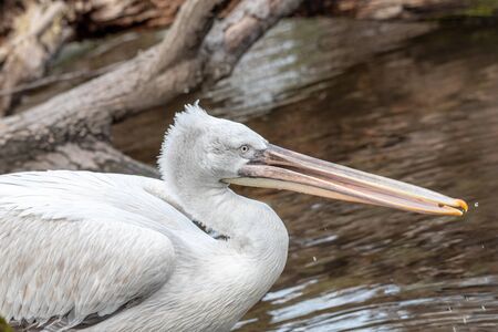 View of a great white pelican also known as the eastern white pelican, a bird in the pelican family. It breeds from southeastern Europe through Asia and Africa, in swamps and shallow lakes